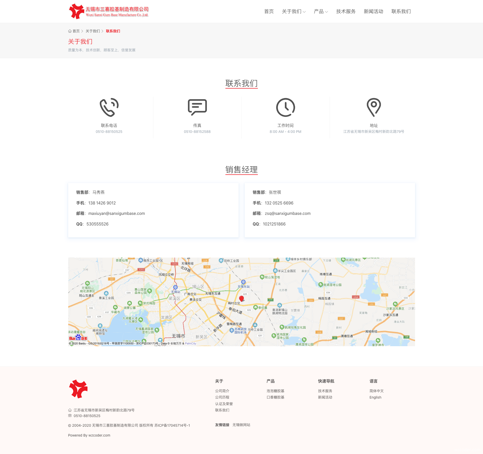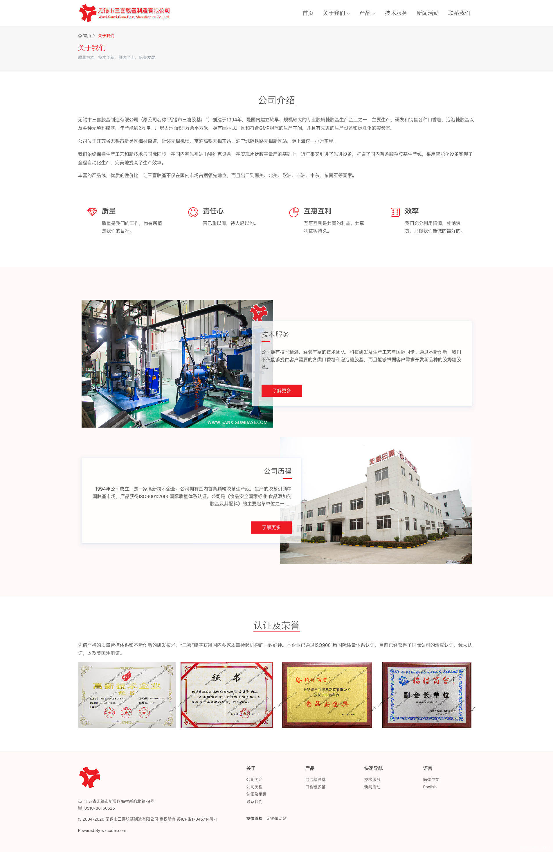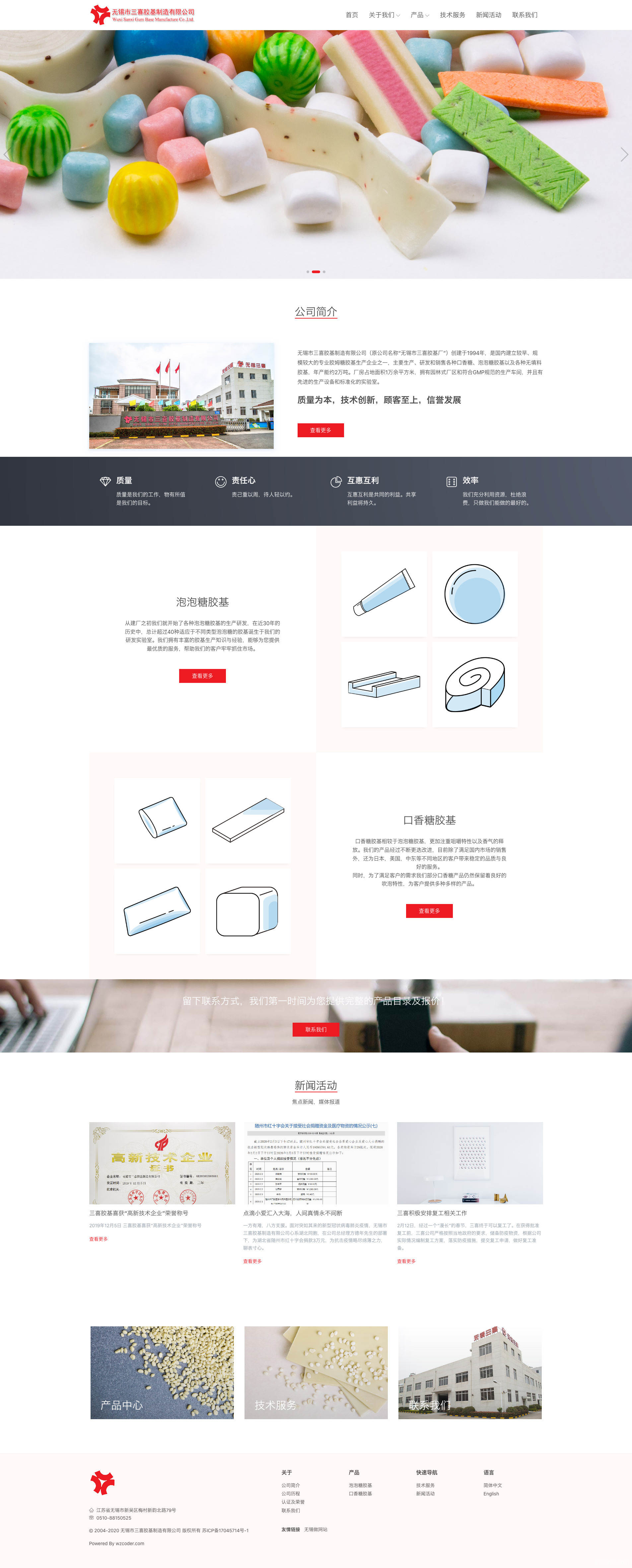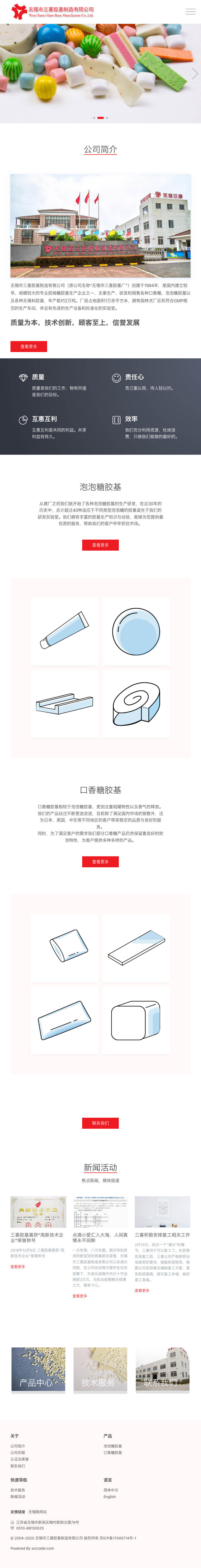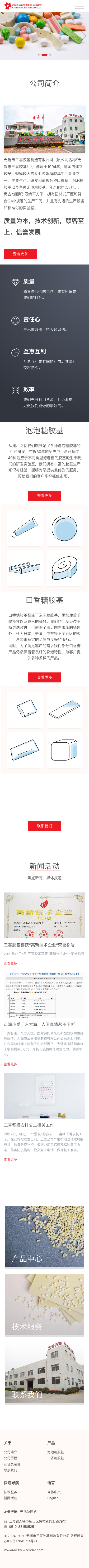 无锡市三喜胶基制造有限公司(原公司名称“无锡市三喜胶基厂”)创建于1994年,是国内建立较早、规模较大的专业胶姆糖胶基生产企业之一,主要生产、研发和销售各种口香糖、泡泡糖胶基以及各种无填料胶基,年产能约2万吨。厂房占地面积1万余平方米,拥有园林式厂区和符合GMP规范的生产车间,并且有先进的生产设备和标准化的实验室。